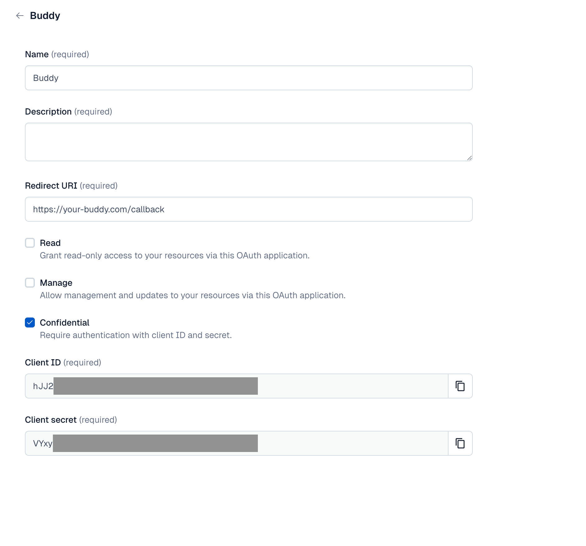 - Copy the Client ID and Client Secret from the application details and paste them into the corresponding fields in Buddy.