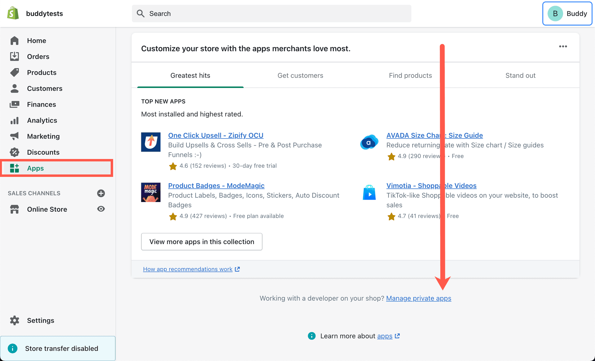 https://{YOUR_STORE_NAME}.myshopify.com/admin. - From the left navigation panel, select Apps.