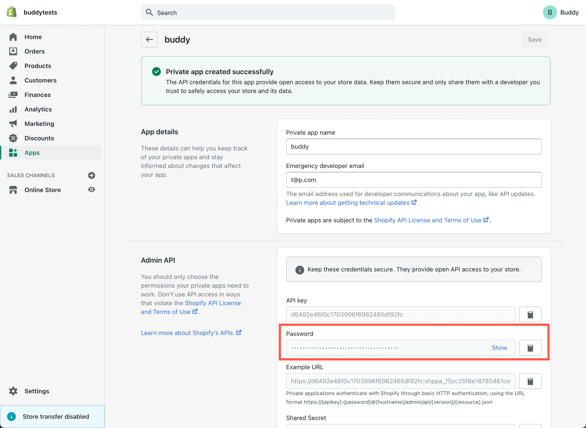 - Paste the app password you copied from Shopify into the Shopify Access Token field.