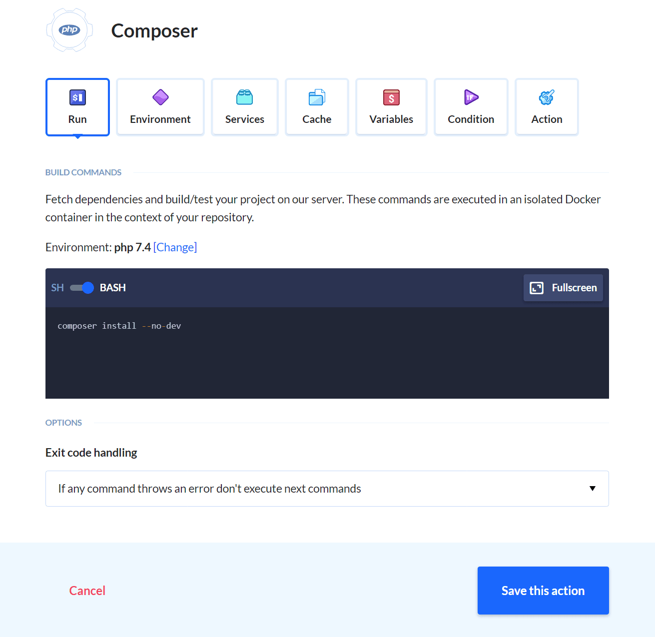 The third step is creating a zip archive with the name plugin_name-version_number.zip. Use the Local Shell action to do that. We need to install zip to be able to do that. Switch to the action's Environment tab and paste this command into the terminal: