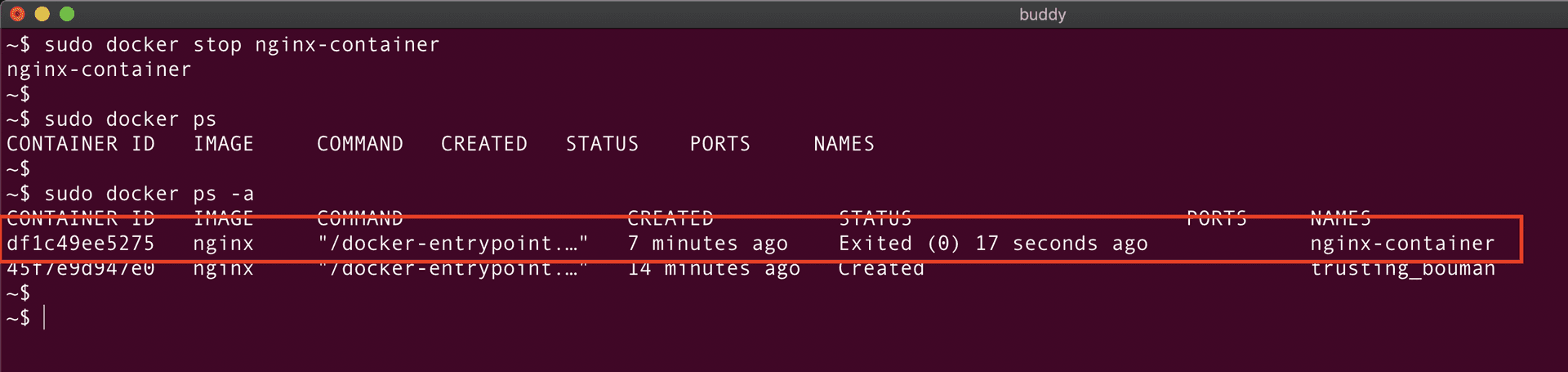 As you can see, the container nginx-container was exited 17 seconds ago. This container won't be listed in the docker ps command.