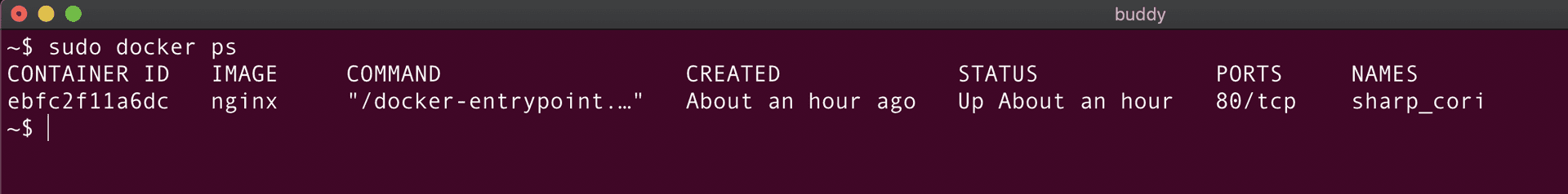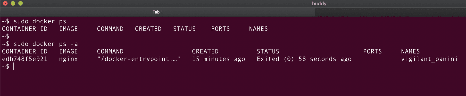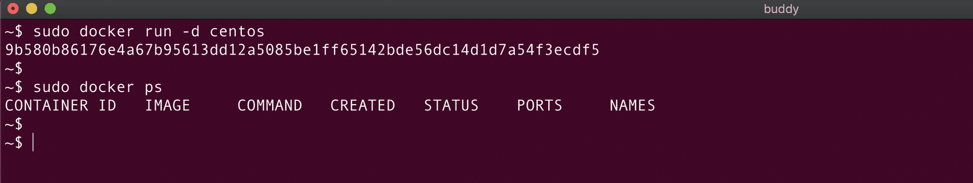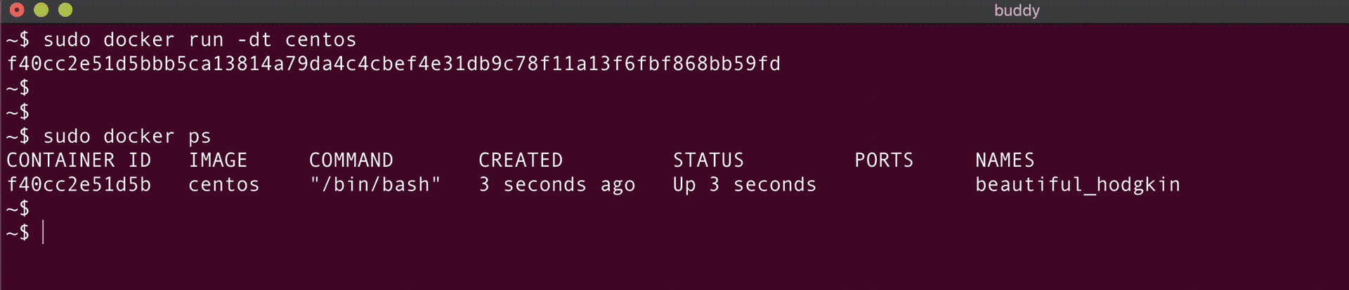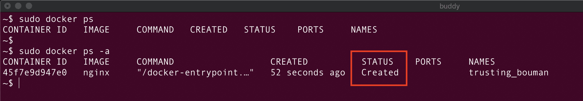 Perfect! The container is created. Let's verify it using the docker ps command: