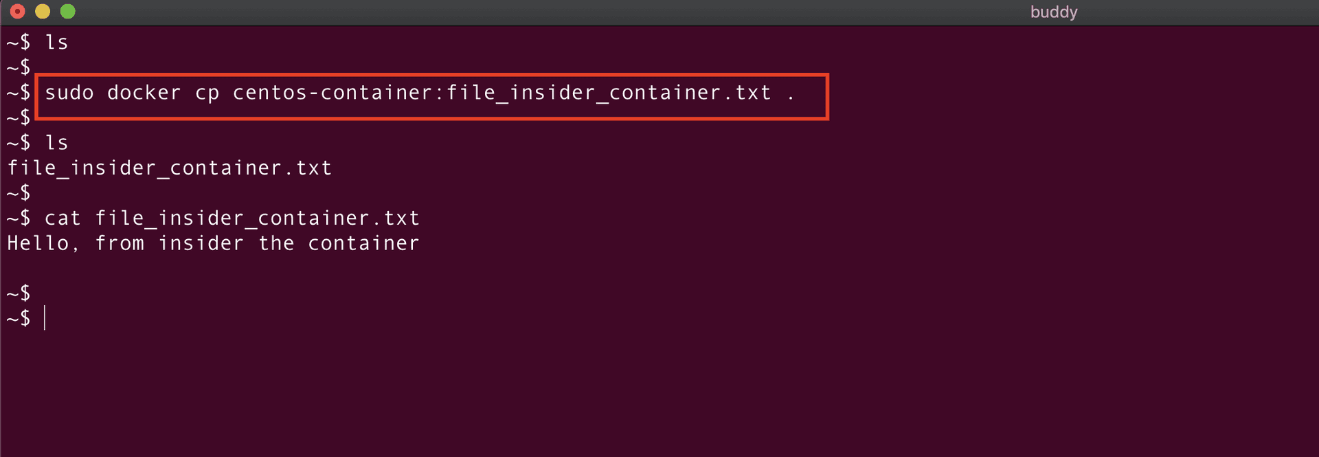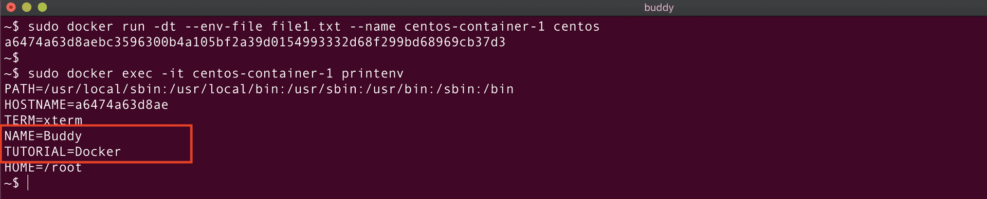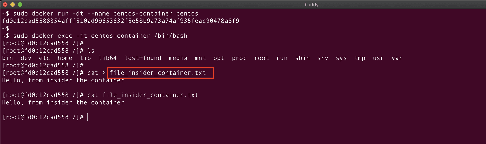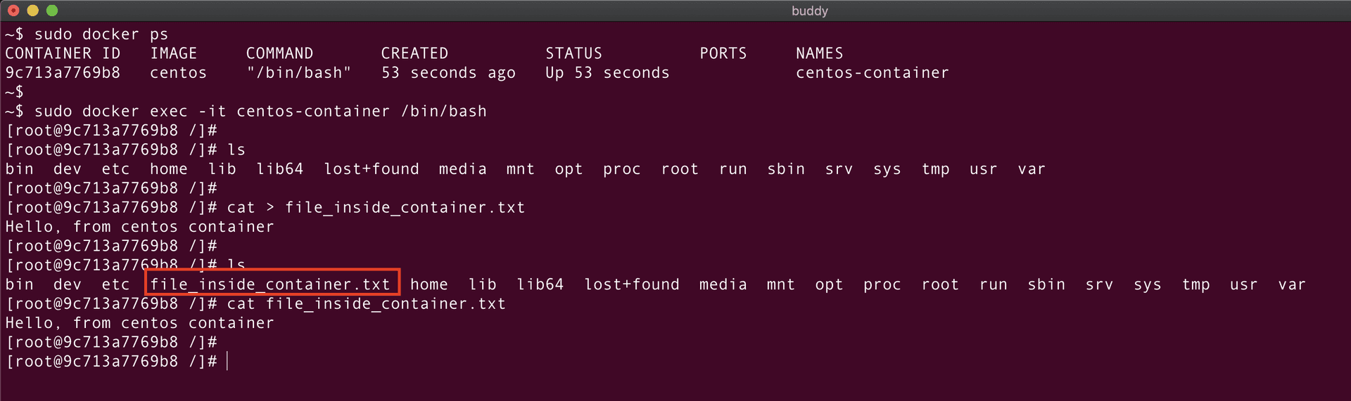 Perfect! The container is created. Let's verify it using the docker ps command: