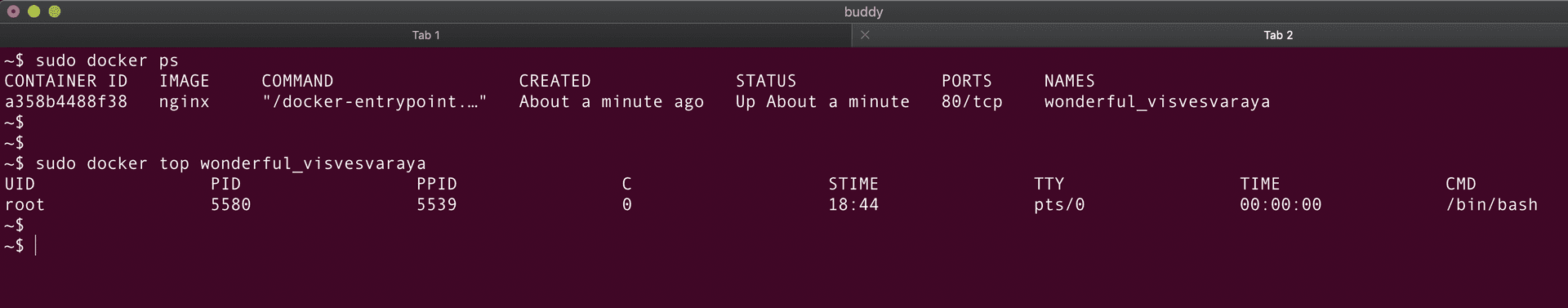 nginx container trusting_bouman is some random string and would be different on your system.
