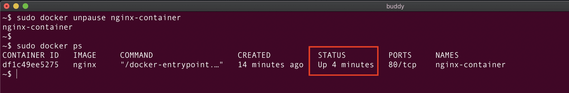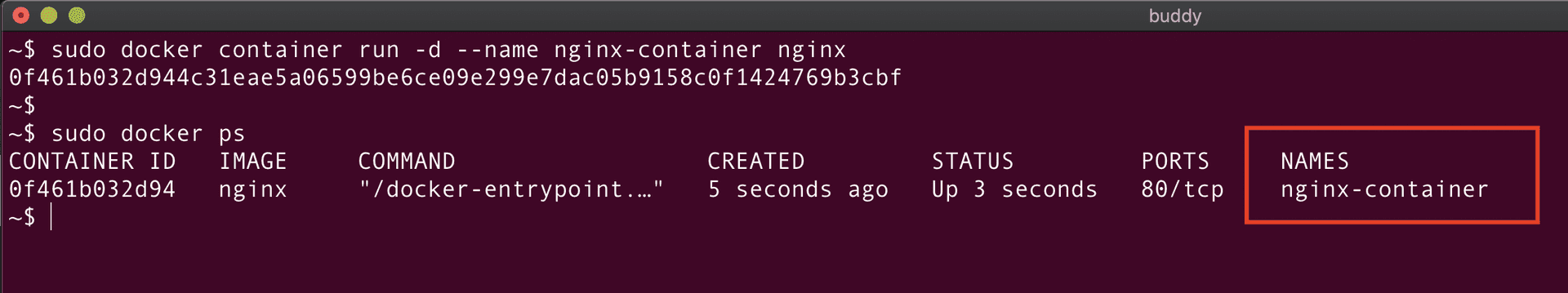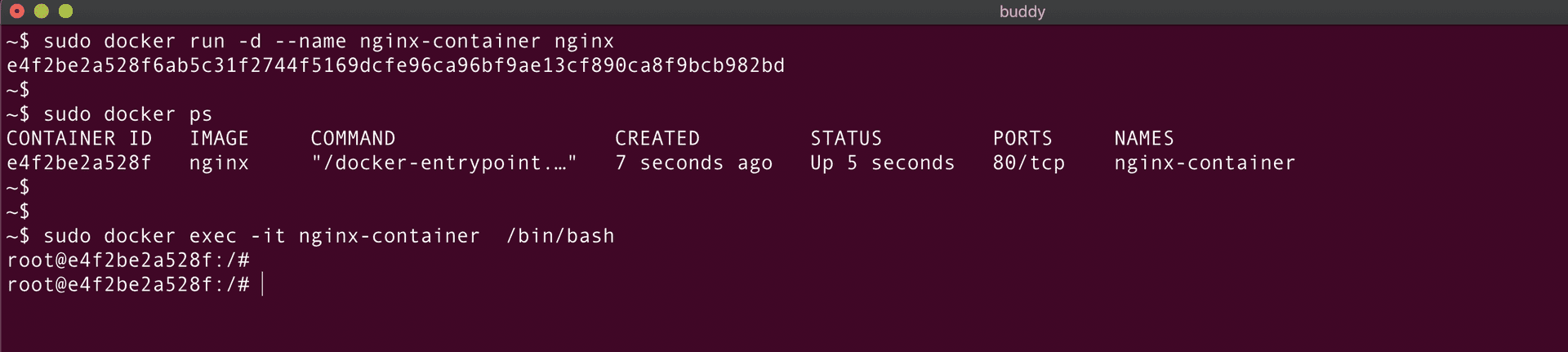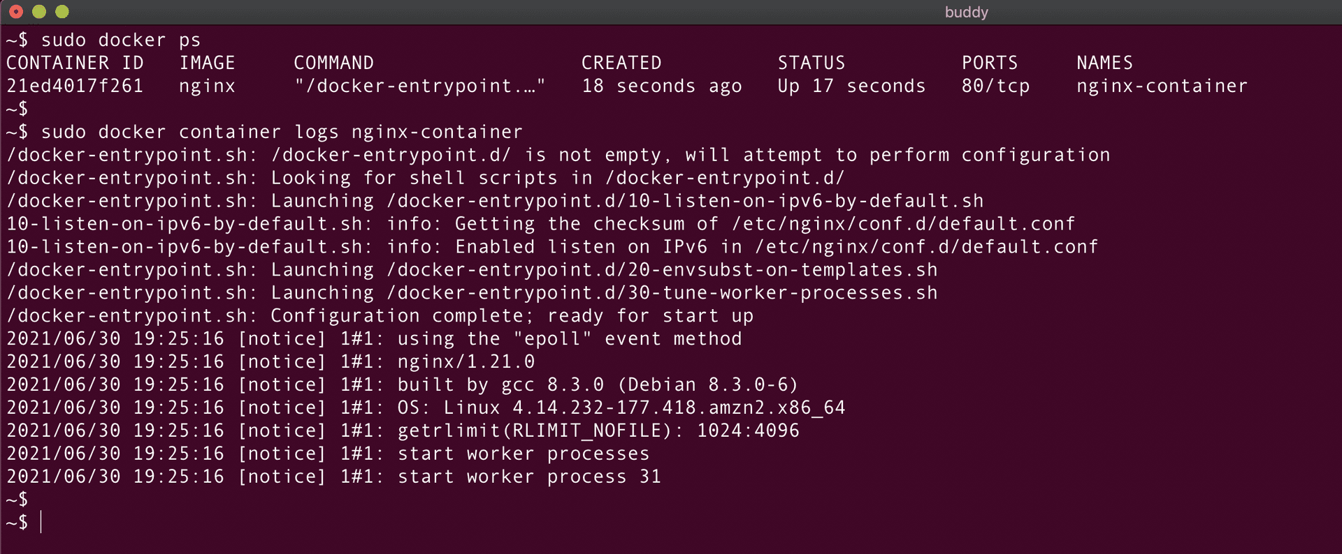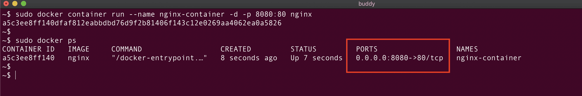 As seen from the above screenshot, nginx-container is created and the docker ps command is used to verify the status of the container.