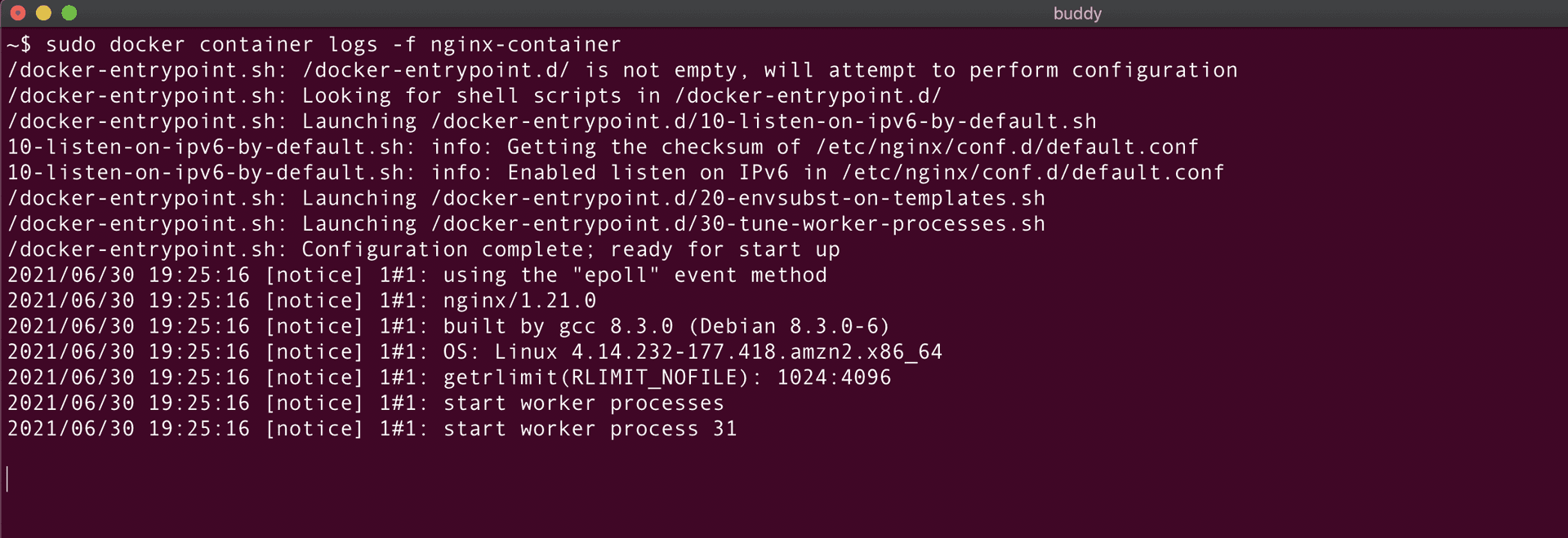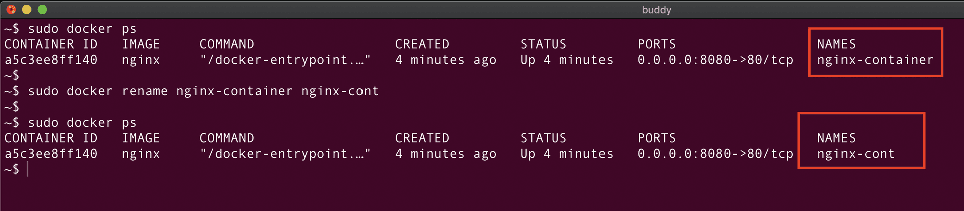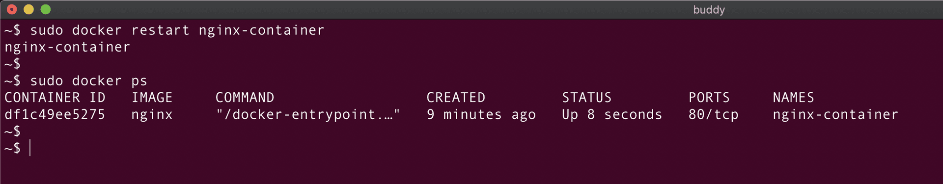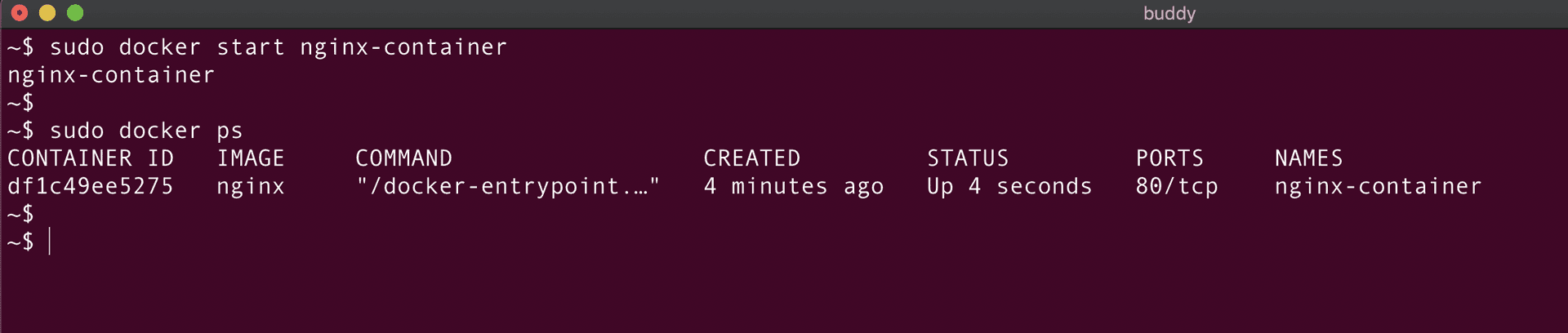 As seen from the above screenshot, nginx-container is created and the docker ps command is used to verify the status of the container.