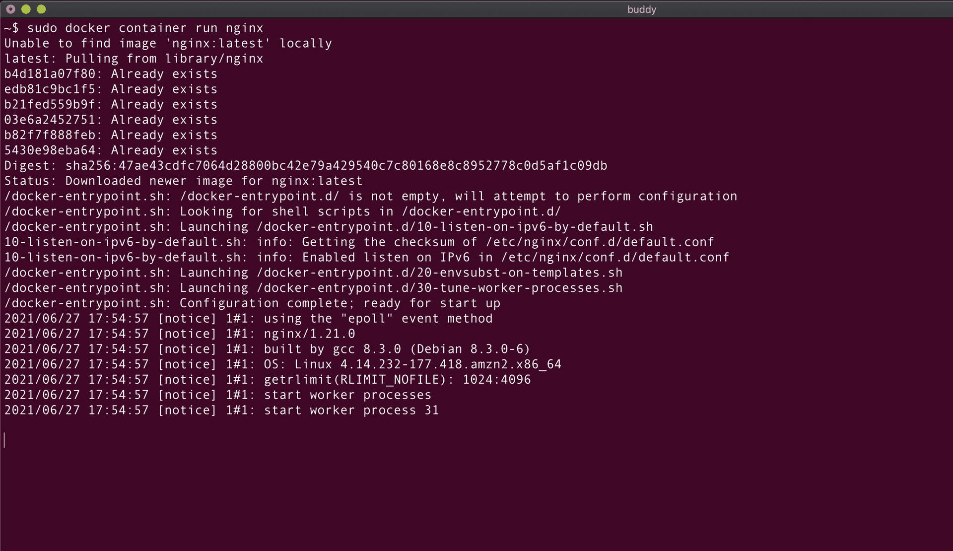 Let's create a container using an NGINX Docker image: