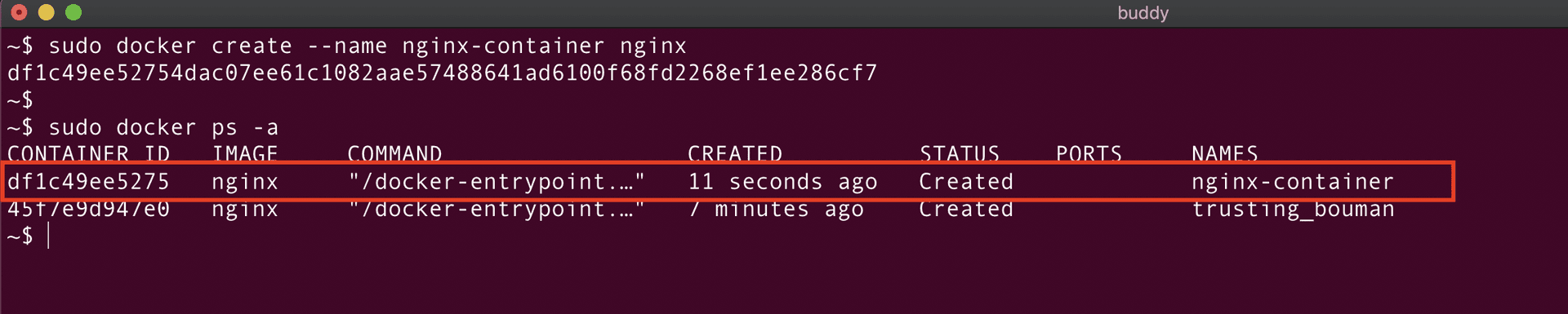 bashdocker create --name nginx-container nginx$