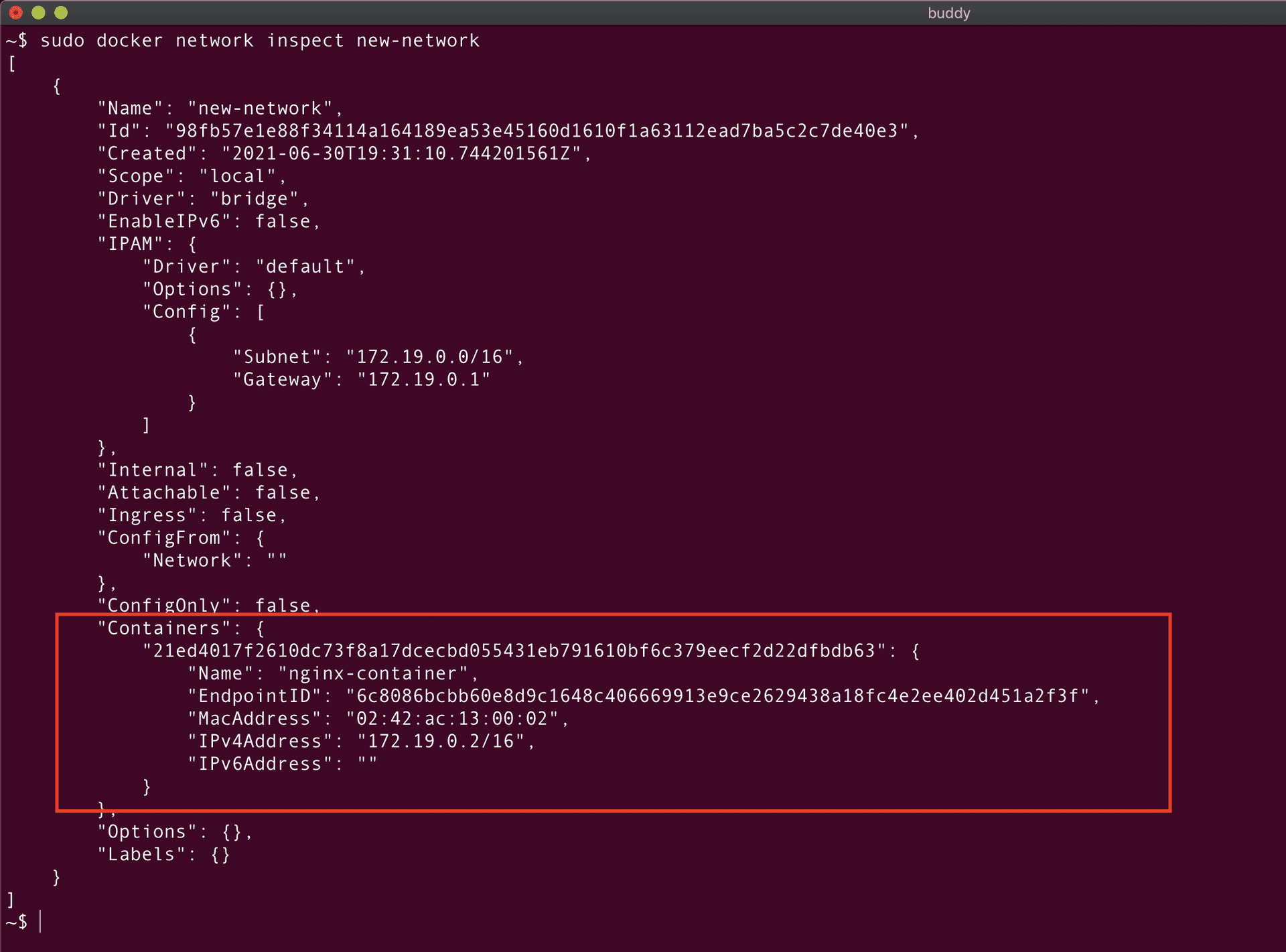 You can retrieve detailed information on attributes and configuration of a specific object by adding its name or ID after the docker inspect command:
