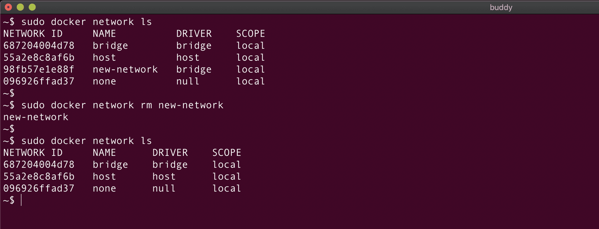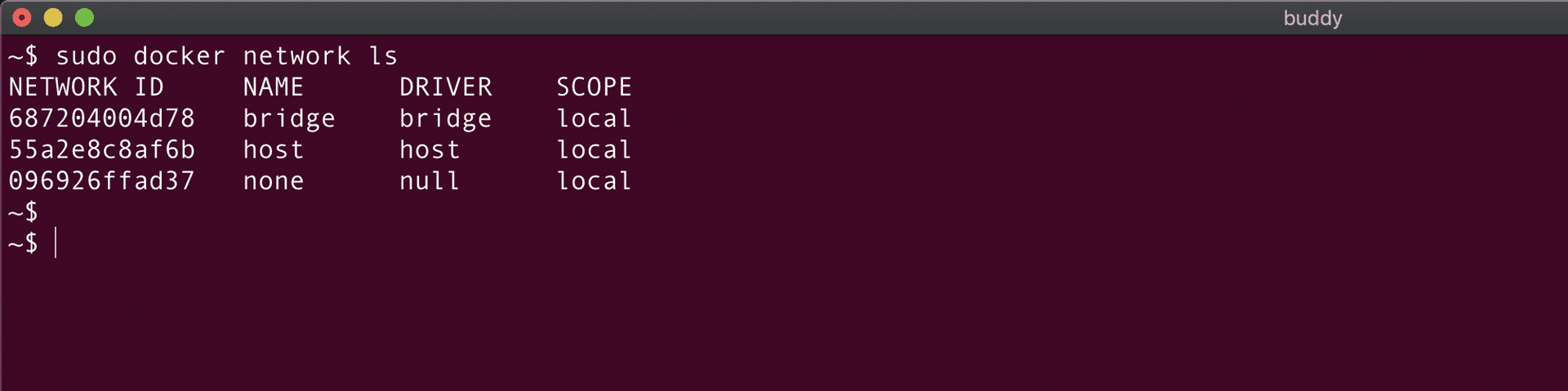 docker network ls | List Docker networks |