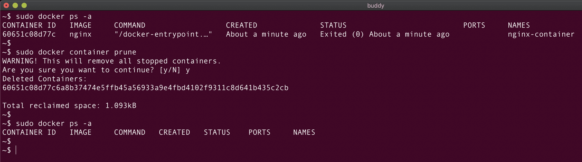 The final command on the list is docker system prune, which is essential to keep up high performance of Docker on your machine: