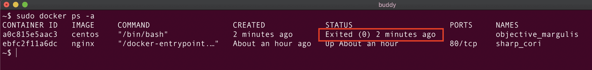 As can be seen from the screenshot above, the container objective_margulis is not running while the container sharp_cori is up since the last hour.