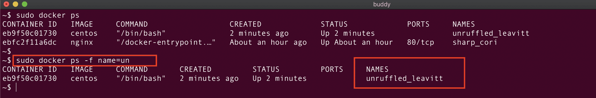 In the screenshot above, the command filters the containers and only displays those whose name starts with un.