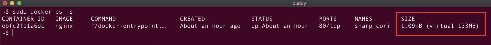 As it can be seen from the screenshot above, 1.09kB is the disk space used by the container (writable layer). In simple words, the value in the SIZE column represents the size of the data that is written by the container in its writable layer.