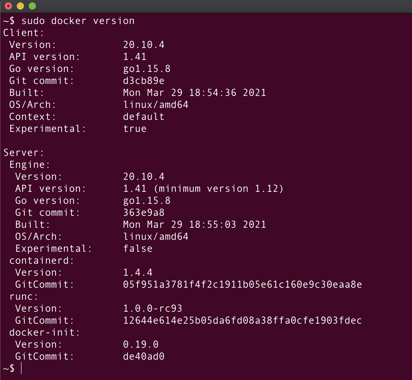 This command provides the details on the Docker installed on your system: