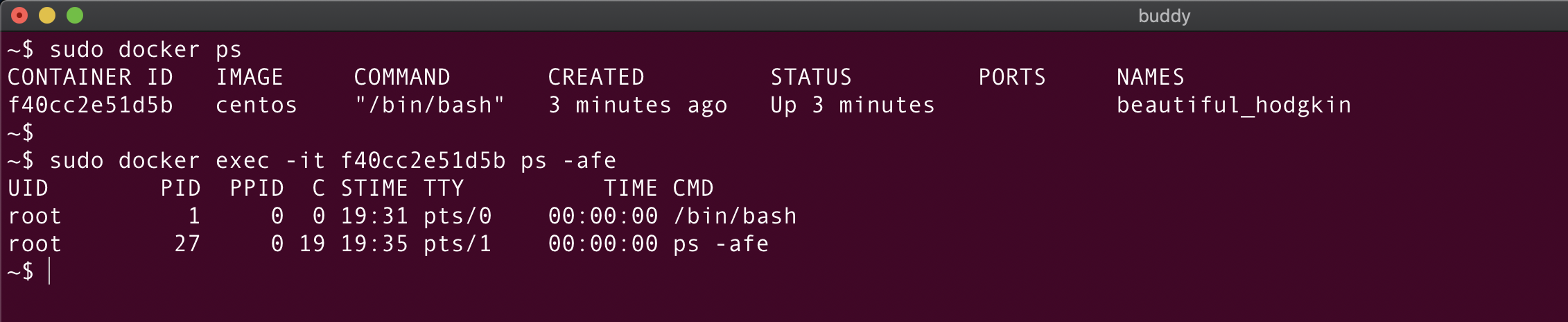 If we end the terminal session by closing the terminal tab or by pressing CMD+C/CTRL + C, the container should die automatically. Running docker ps will confirm this is what indeed happened: